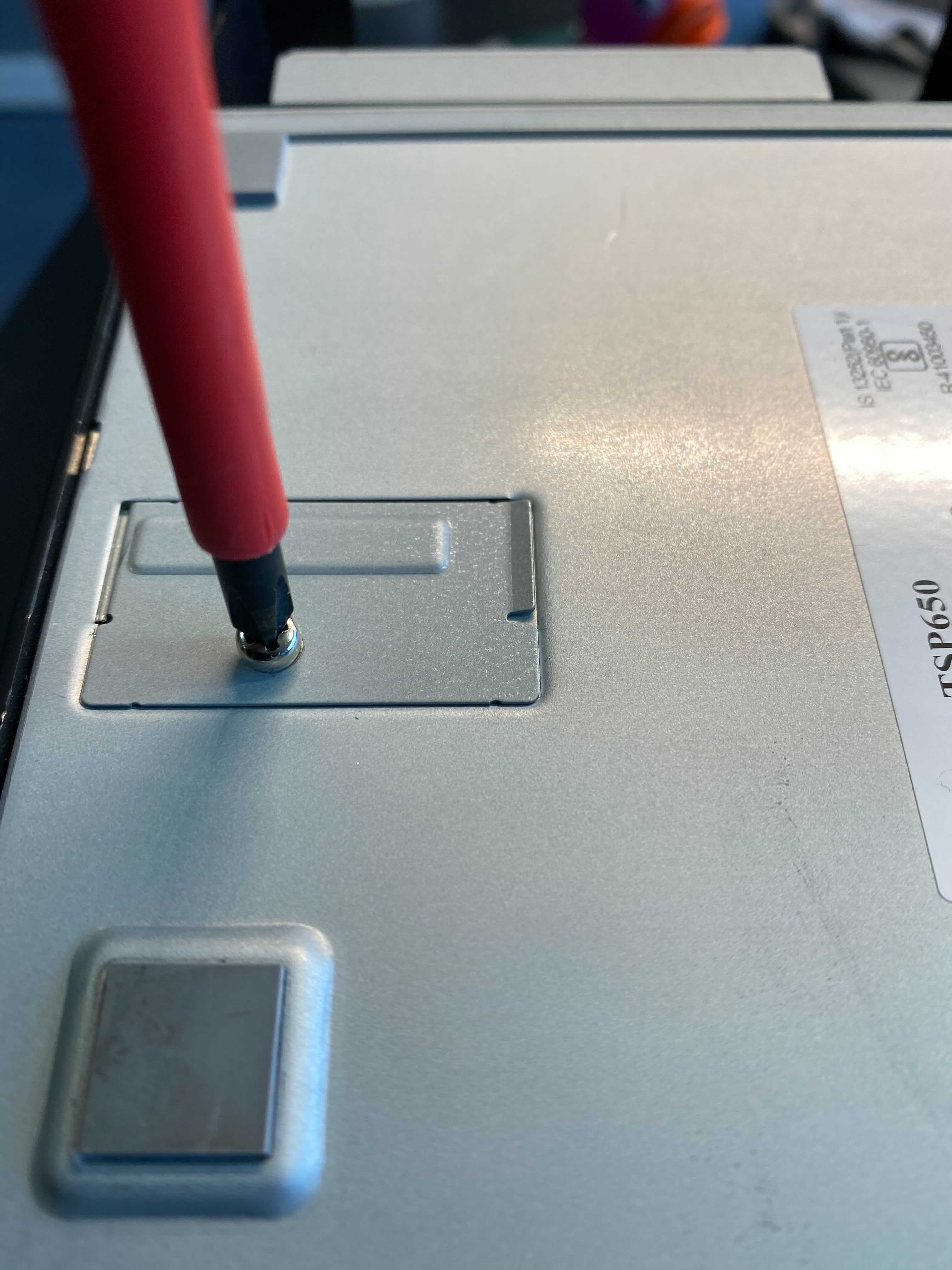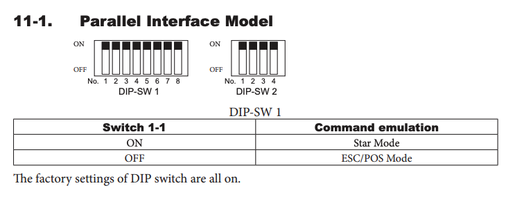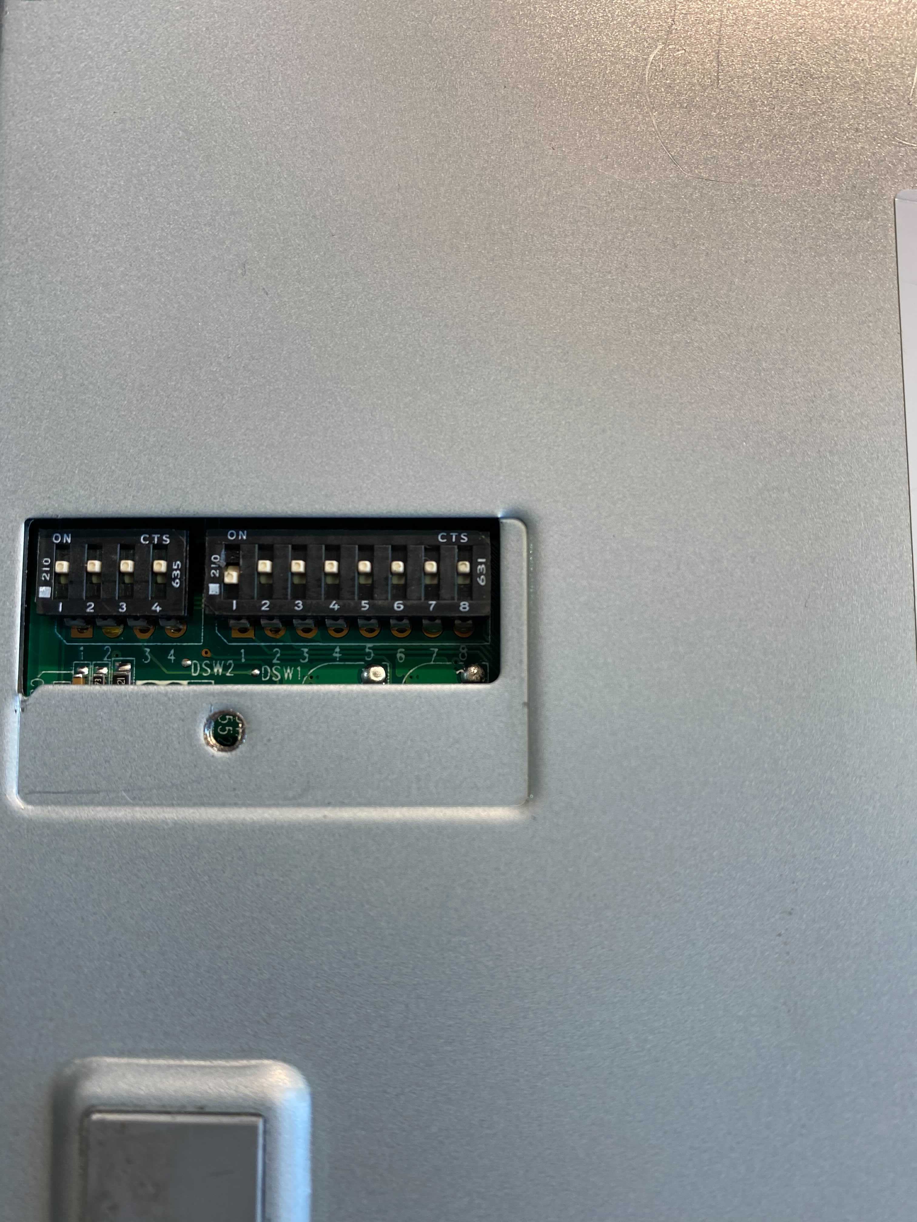Op de achterkant van de printer vind je een klepje die open geschroefd kan worden. Onder dat klepje vind je een rijtje met switches die aan of uit gezet kunnen worden. Op de tweede foto vind je de configuratie zoals hij zou moeten staan om de printer goed te laten werken. Dit betekent dus dat de eerste switch in het rijtje van 8 naar beneden moet staan.